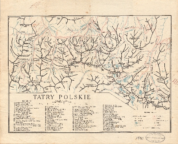 Mapa grzbietowa Tatr Polskich. Zaznaczona sieć hydrograficzna. Komunikacja - drogi. Osadnictwo. Zaznaczone szałasy i jaskinie. Objaśnienia i opisy obiektów oznaczonych na mapie liczbami.