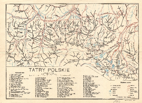 Mapa grzbietowa Tatr Polskich. Zaznaczona sieć hydrograficzna. Komunikacja - drogi. Osadnictwo. Zaznaczone szałasy i jaskinie. Objaśnienia i opisy obiektów oznaczonych na mapie liczbami.