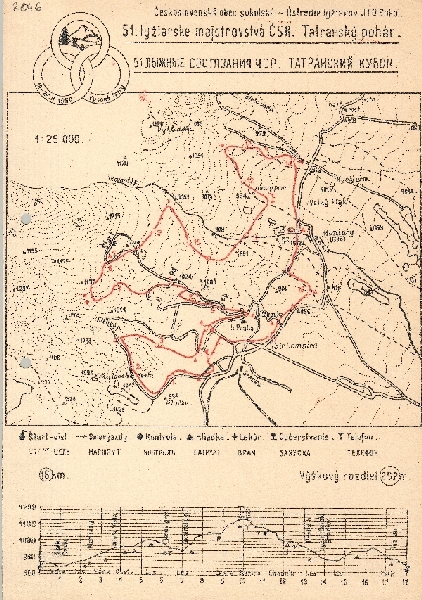 Schematyczna mapa południowej części Tatr Wysokich z zaznaczoną trasą narciarską. W podkładzie poziomice, punkty wysokościowe. Komunikacja - koleje i drogi. Osadnictwo. Dodatkowo przekrój pionowy trasy. Objaśnienia.