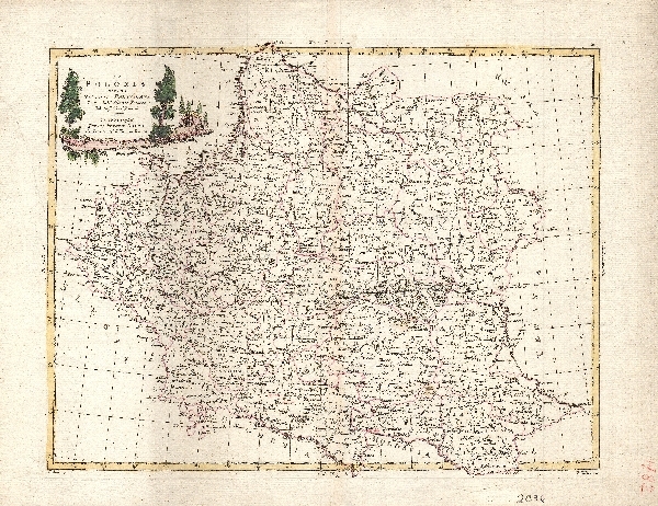 Mapa Polski. Obszary górskie zaznaczone kopcami, zaznaczone obszary podmokłe. Zaznaczona sieć hydrograficzna, miejscowości i ręcznie kolorowane granice administracyjne. Miedzioryt, kolorowany recznie.