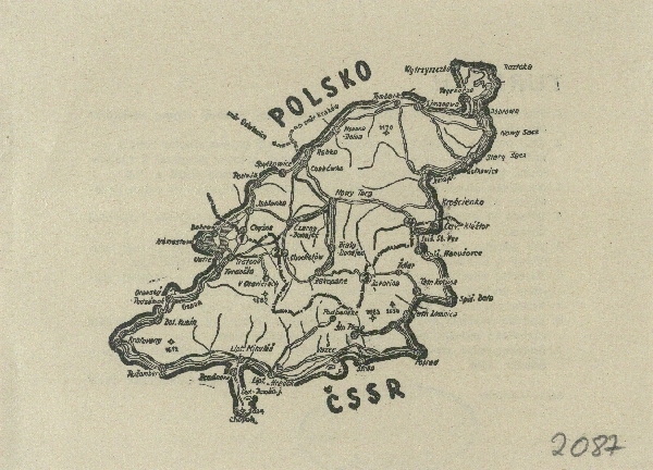 Ulotka informacyjna z planem obszaru Konwencji Turystycznej w rejonie Tatr i Podhala z lat 60. XX w. Zaznaczone miejscowości, drogi, koleje, granice państwowe i granice obszaru konwencji. Brak skali.