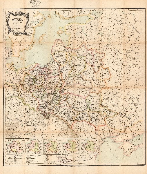 Mapa administracyjna Ziem Polskich przed rozbiorami. Grzbiety górskie zaznaczone metodą kresek. Sieć hydrograficzna. Osadnictwo. Zaznaczono granice administracyjne. Dodatkowo 5. map ukazujących zmiany granic Polski od 1772 r. oraz granice okręgu Wolnego Miasta Krakowa w latach 1815 - 1846. W objaśnieniach opis podziału administracyjnego.