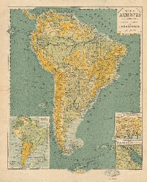 Mapa przeglądowa Ameryki Południowej. Obszary górskie zaznaczone symbolicznie przy pomocy kresek. Barwami wyróżniono wyżyny, niziny i depresje. Sieć hydrograficzna. Zaznaczone miejscowości i granice administracyjne. Dodatkowo mapa polityczna Ameryki Południowej, okolice miasta Rio de Janeiro i Buenos Aires.