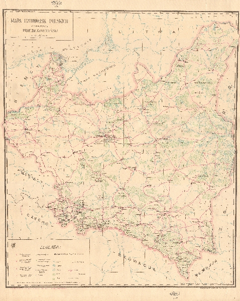Mapa uzdrowisk na Ziemiach Polskich. Zaznaczona sieć hydrograficzna, obszary zalesione, komunikacja - koleje i drogi, miejscowości. Wyróżniono zakłady zdrojowe, letniska, stacje klimatyczne i inne wg legendy.