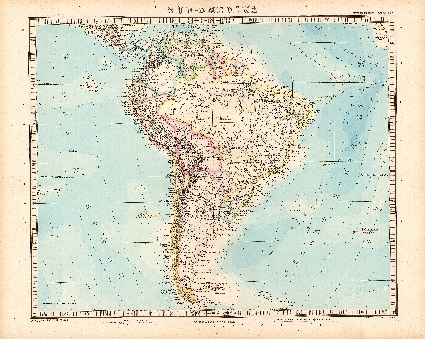Mapa przeglądowa Ameryki Południowej. Obszary górskie zaznaczone metodą kresek. Sieć hydrograficzna. Zaznaczono miejscowości i granice polityczne, administracyjne.