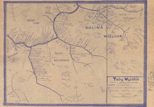 Ozalidowa kopia mapy grzbietowej otoczenia Doliny Wielickiej, Batyżowieckiej i Kaczej. Zaznaczone granie, szczyty, przełęcze. Sieć hydrograficzna. Zaznaczone drogi i szlaki oraz schroniska turystyczne. Objaśnienia.