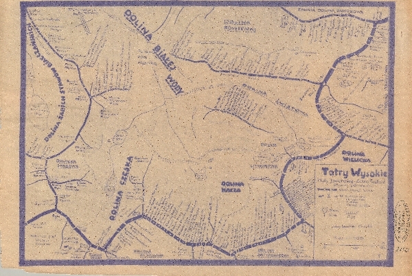 Ozalidowa kopia mapy grzbietowej otoczenia Doliny Kaczej. Zaznaczone granie, szczyty, przełęcze. Sieć hydrograficzna. Zaznaczone drogi i szlaki oraz schroniska turystyczne. Objaśnienia.