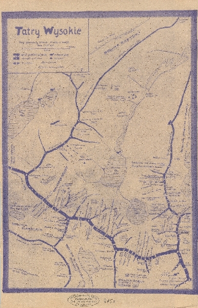 Ozalidowa kopia mapy grzbietowej otoczenia Morskiego Oka. Zaznaczone granie, szczyty, przełęcze. Sieć hydrograficzna. Zaznaczone drogi i szlaki oraz schroniska turystyczne. Objaśnienia.