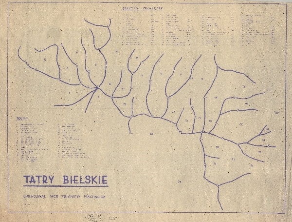 Ozalidowa kopia mapy grzbietowej Tatr Bielskich. Zaznaczone granie, szczyty, przełęcze. Obiekty opisane liczbami wyjaśnionymi w legendzie.
