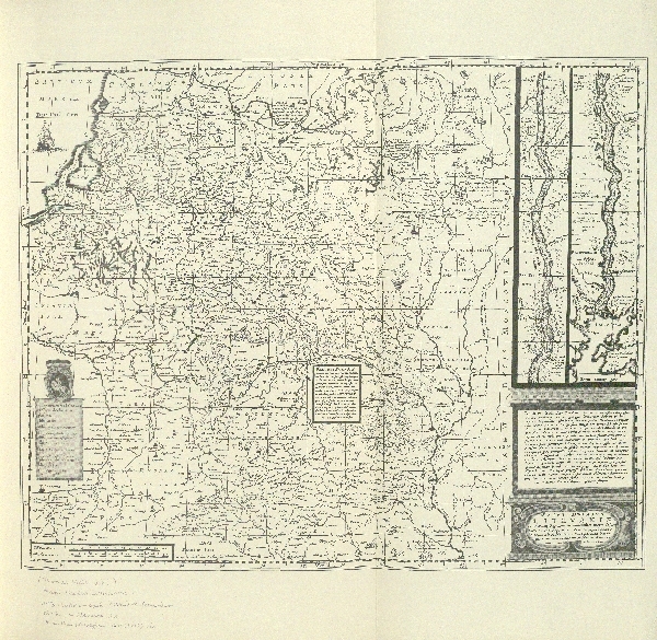 Mapa przeglądowa obejmująca Polskę i Litwę. Obszary górskie zaznaczono kopcami. Nie zaznaczono obszary Tatr i Karpat. Sieć hydrograficzna. Zaznaczono obszary zalesione, miejscowości, granice administracyjne. Dodatkowo mapa Dniepru. Objaśnienia.