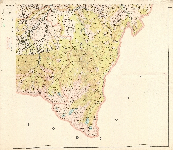 Mapa topograficzna powiatu Nowy Targ obejmująca Tatry Wysokie i Zakopane. Rzeźba przedstawiona przy pomocy poziomic i punktów wysokościowych. Sieć hydrograficzna. Zaznaczono obszary zalesione. Komunikacja - drogi i koleje, kolej linowa. Osadnictwo. Zaznaczono granice administracyjne. Objaśnienia na arkuszu 4. Na mapie odręcznie zaznaczono granice gminy.