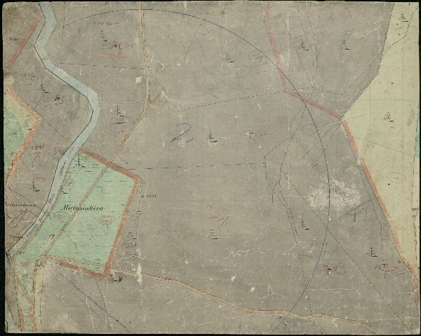 Kolorowana mapa katastralna Doliny Kościeliskiej z uwagami z epoki. Brak legendy.