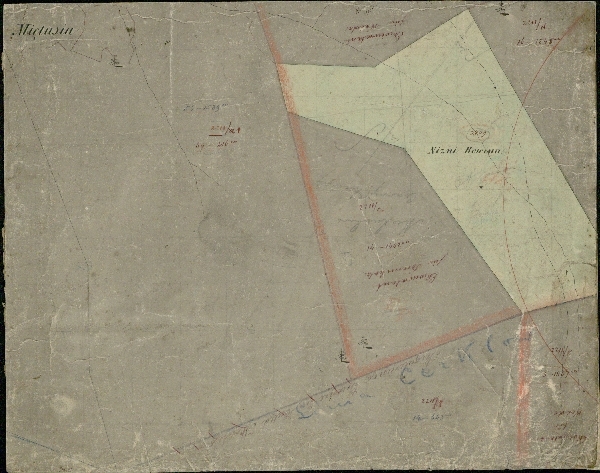 Kolorowana mapa katastralna Doliny Kościeliskiej z uwagami z epoki. Brak legendy.