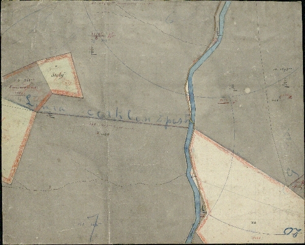 Kolorowana mapa katastralna Doliny Kościeliskiej z uwagami z epoki. Brak legendy.