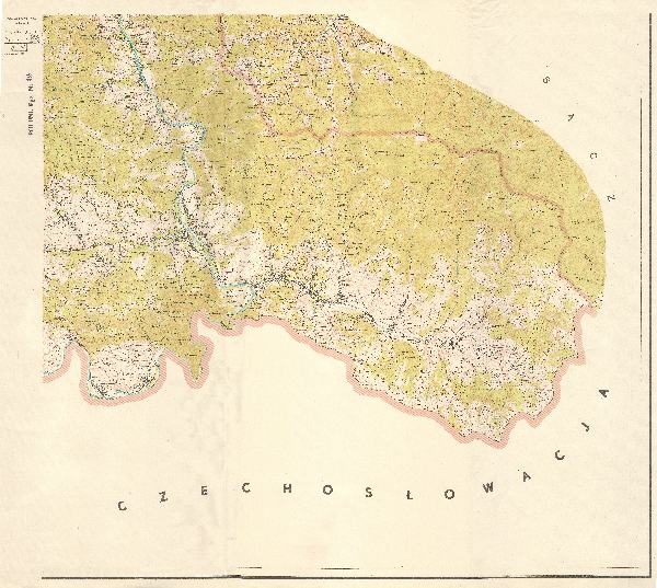 Mapa topograficzna powiatu Nowy Targ obejmująca Pieniny w rejonie Szczawnicy. Rzeźba przedstawiona przy pomocy poziomic i punktów wysokościowych. Sieć hydrograficzna. Zaznaczono obszary zalesione. Komunikacja - drogi. Osadnictwo. Zaznaczono granice administracyjne. Objaśnienia na arkuszu 4.