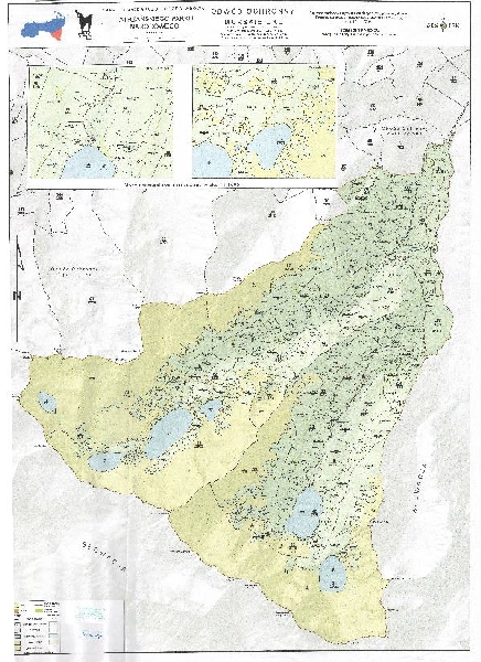 Mapa obwodu ochronnego Morskie Oko. W podkładzie poziomice i sieć hydrograficzna. Zaznaczono granice administracyjne i podział na oddziały i pododdziały. Barwami zaznaczono formy użytkowania terenu. Dodatkowo szczegółowe mapy otoczenia Morskiego Oka i Przedniego Stawu Gąsienicowego w skali 1:5 000. Objaśnienia.