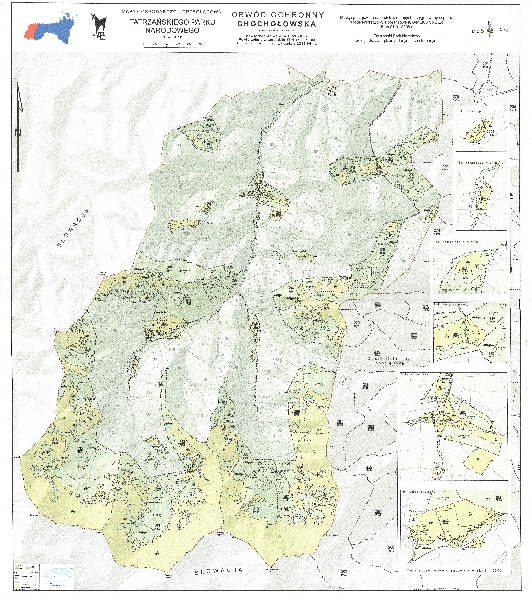 Mapa obwodu ochronnego Chochołowska. W podkładzie poziomice i sieć hydrograficzna. Zaznaczono granice administracyjne i podział na oddziały i pododdziały. Barwami zaznaczono formy użytkowania terenu. Dodatkowo szczegółowe mapy Polany Przysłop, Jarząbcza Niżnia, Kominiarska Niżnia, Huty Lejowe, Huciska i Chochołowska w skali 1:5 000. Objaśnienia.