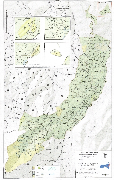 Mapa obwodu ochronnego Łysa Polana. W podkładzie poziomice i sieć hydrograficzna. Zaznaczono granice administracyjne i podział na oddziały i pododdziały. Barwami zaznaczono formy użytkowania terenu. Dodatkowo szczegółowe mapy przejścia granicznego Łysa Polana, Palenica Białczańska i Głodówka w skali 1:3 000. Objaśnienia.
