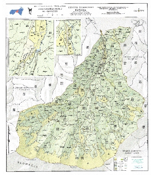 Mapa obwodu ochronnego Kuźnice. W podkładzie poziomice i sieć hydrograficzna. Zaznaczono granice administracyjne i podział na oddziały i pododdziały. Barwami zaznaczono formy użytkowania terenu. Dodatkowo szczegółowe mapy otoczenia Kuźnic w skali 1:3 000 oraz Kuźnicka Polana w skali 1:5 000. Objaśnienia.