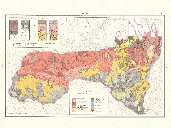 Mapa gleb Tatrzańskiego Parku Narodowego. Na podkładzie poziomicowym zaznaczono typy gleb. dodatkowo profile charakterystycznych gleb tatrzańskich. Objaśnienia.
