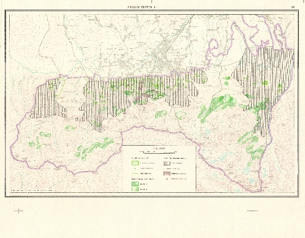 Mapa drzewostanów polskiej części Tatr. Na podkładzie poziomicowym zaznaczono zasięgi buka, świerku, jaworu i cisa. Objaśnienia.