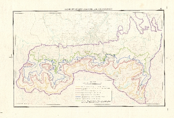 Mapa zasięgu lasów i kosodrzewiny w Tatrach Polskich. Na podkładzie poziomicowym zaznaczono obecne granice lasu i potencjalne górne granice zasięgu kosodrzewiny i lasu oraz obniżoną gospodarczo górną granicę lasu. Objaśnienia.