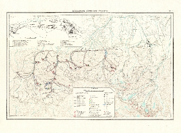 Mapa dawnego górnictwa i przemysłu na obszarze Tatr Polskich. Na podkładzie poziomicowym zaznaczono złoża, kopalnie i zakłady przemysłowe, a także drogi hawiarskie. Dodatkowo plan zakładów hutniczych w Kuźnicach w końcu XIX w. Objaśnienia.