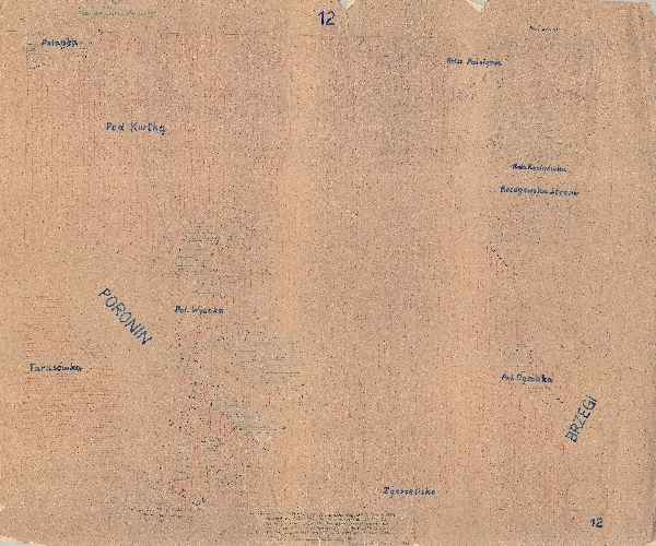 Mapa katastralna Brzegów, rejon Zgorzelisko. Zaznaczone własności i współwłasności gruntów.