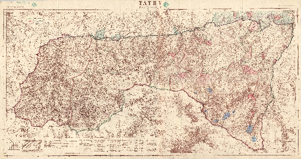 Reprodukcja jednobarwna mapy fotogrametrycznej Tatr z 1938 r. z naniesionymi odręcznie opisami współwłasności i oznaczeniami. Bez objaśnień.