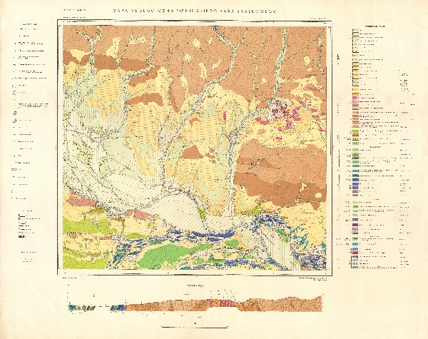 Szczegółowa mapa geologiczna Tatr obejmująca litologię, stratygrafię i tektonikę, wykonana na podkładzie mapy topograficznej, obejmująca rejon Czorsztyna. Zaznaczone poziomice i sieć hydrograficzna. Objaśnienia symboli oraz znaków. Pod mapą przekrój geologiczny.