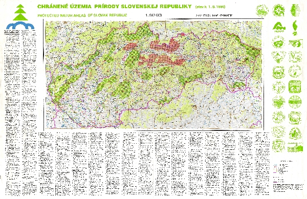 Przeglądowa mapa Słowacji z zaznaczonymi parkami narodowymi i innymi obszarami chronionymi. Wszystkie obiekty chronione opisane w objaśnieniach poza ramką. Dodatkowo loga parków narodowych i rezerwatów krajobrazowych.