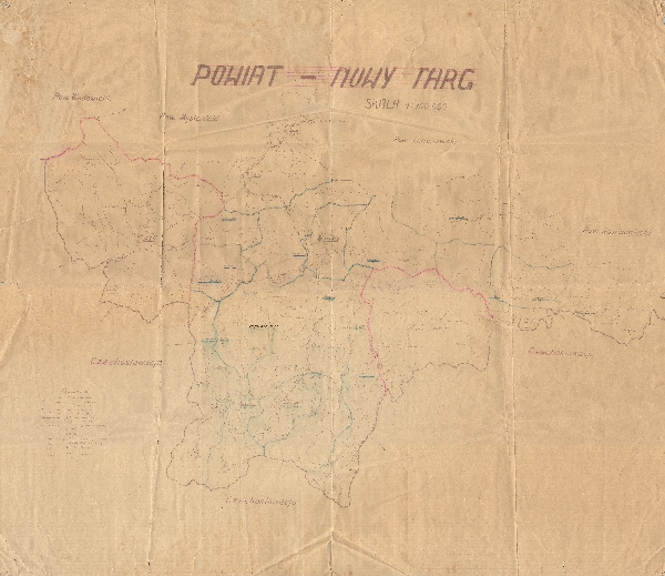 Mapa powiatu Nowy Targ z zaznaczonymi granicami administracyjnymi powiatu i gmin. W podkładzie sieć rzeczna, linie kolejowe i ważniejsze drogi. Odręcznie zaznaczone granice niektórych gmin. Objaśnienia.