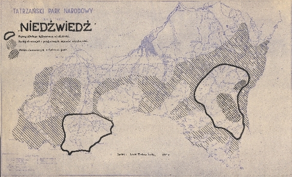 Rejony stałego bytowania niedźwiedzi, zasięgi okresowych pojawów niedźwiedzi i stwierdzonych gawr naniesione na mapie administracyjnej Tatrzańskiego Parku Narodowego.