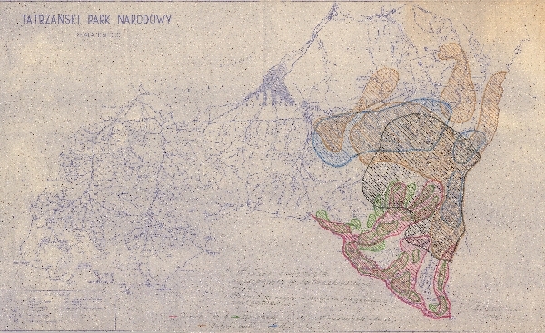 Rozmieszczenie kozicy, świstaka, niedźwiedzia, jelenia i rysia we wschodniej części Tatrzańskiego Parku Narodowego naniesione na mapie administracyjnej Tatrzańskiego Parku Narodowego.