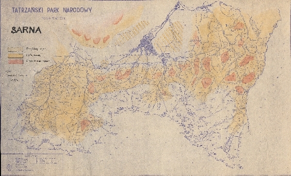 Ostoje i zasięg występowania sarny naniesione na mapie administracyjnej Tatrzańskiego Parku Narodowego.