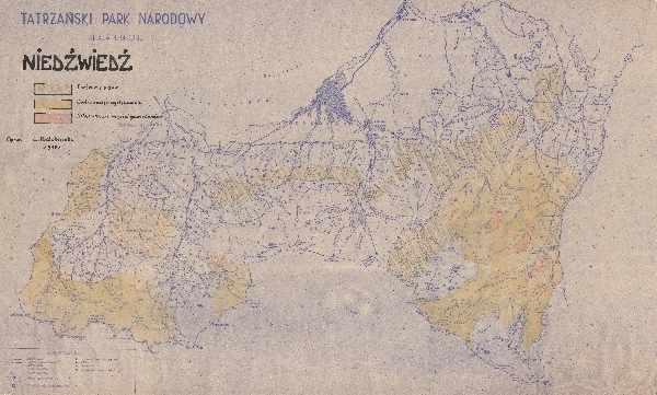 Ostoje i zasięg występowania niedźwiedzia naniesione na mapie administracyjnej Tatrzańskiego Parku Narodowego.