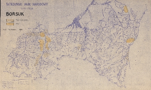 Ostoje i zasięg występowania borsuka naniesione na mapie administracyjnej Tatrzańskiego Parku Narodowego.