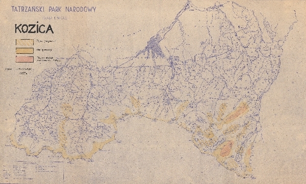 Ostoje i zasięg występowania kozic naniesione na mapie administracyjnej Tatrzańskiego Parku Narodowego.