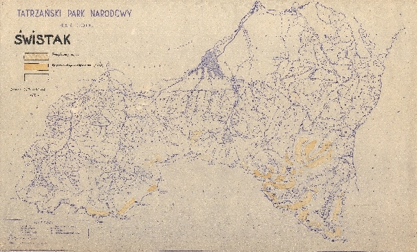 Ostoje i zasięg występowania świstaka naniesione na mapie administracyjnej Tatrzańskiego Parku Narodowego.
