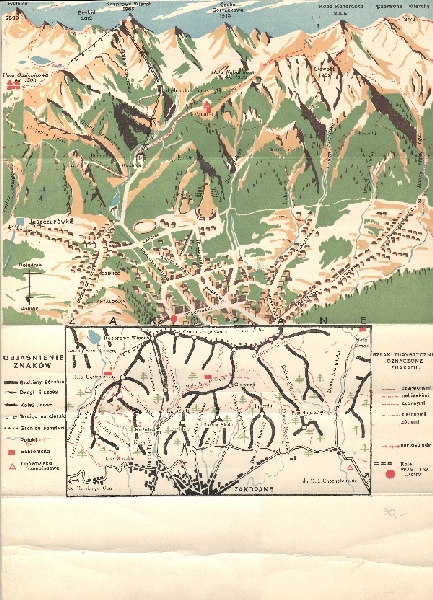 Widok na Tatry od północnego - zachodu. Wersja letnia z zaznaczonymi szlakami turystycznymi i schroniskami. Plan Zakopanego. U góry nazwy ważniejszych szczytów i ich wysokości. Legenda.