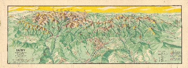 Widok panoramiczny na całe Tatry i Zakopane od północy. Wersja letnia z zaznaczonymi szlakami turystycznymi i schroniskami. Zaznaczone nartostrady, koleje, koleje linowe i drogi. U góry nazwy ważniejszych szczytów i ich wysokości. Naniesiono placówki PTTK. Plan Zakopanego. Legenda.