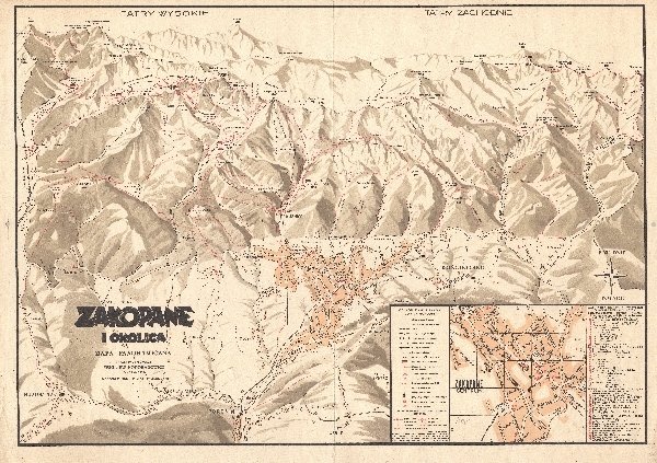 Mapa panoramiczna obejmująca Zakopane oraz Tatry Wysokie i Tatry Zachodnie. W górach zaznaczone szlaki turystyczne i narciarskie oraz schroniska i kolej linowa. W rogu powiększony wycinek planu centrum Zakopanego (33x18 cm).