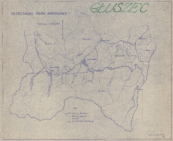 Odrys z mapy Tatr z zaznaczeniem granic politycznych oraz granic parku i sąsiadujących z nim gmin. Zaznaczono granice obszarów leśnych. Zatytułowana: "Głuszec" - dane nie zostały wprowadzone na mapie.