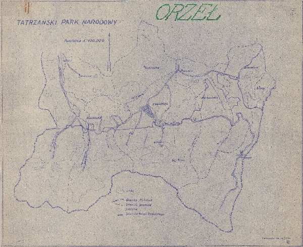 Odrys z mapy Tatr z zaznaczeniem granic politycznych oraz granic parku i sąsiadujących z nim gmin. Zaznaczono granice obszarów leśnych. Zatytułowana: "Orzeł" - dane nie zostały wprowadzone na mapie.