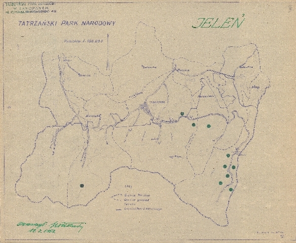 Odrys z mapy Tatr z zaznaczeniem granic politycznych oraz granic parku i sąsiadujących z nim gmin. Zaznaczono granice obszarów leśnych. Zaznaczone rozmieszczenie jelenia.