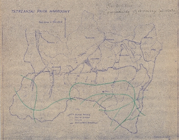 Odrys z mapy Tatr z zaznaczeniem granic politycznych oraz granic parku i sąsiadujących z nim gmin. Zaznaczono granice obszarów leśnych. Naniesiono informacje o przechodach niedźwiedzi z ostatnich lat.