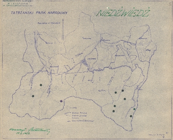 Odrys z mapy Tatr z zaznaczeniem granic politycznych oraz granic parku i sąsiadujących z nim gmin. Zaznaczono granice obszarów leśnych. Naniesiono informacje o występowaniu niedźwiedzia.