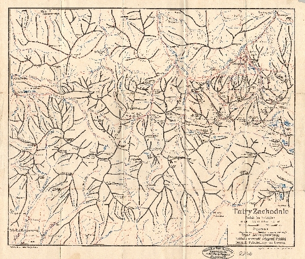 Mapa graniowa obejmująca Tatry Zachodnie. Zaznaczone granie, ważniejsze szczyty, sieć rzeczna, jeziora. Drogi i szlaki turystyczne.