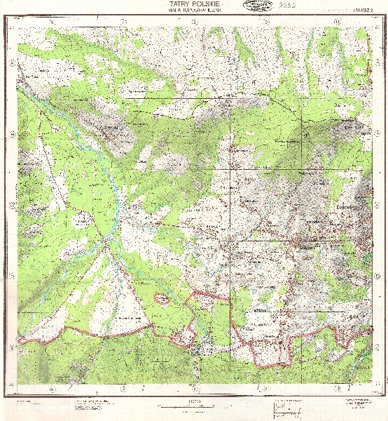 Mapa topograficzna obejmująca Kościelisko i Witów. Rzeźba przedstawiona za pomocą poziomic i cieniowania oraz rysunek skał. Sieć hydrograficzna. Siatka kilometrowa. Zaznaczone obszary zalesione. Naniesiona treść turystyczna (szlaki turystyczne, ścieżki i drogi leśne). Komunikacja - drogi. Osadnictwo. Granica parku narodowego.