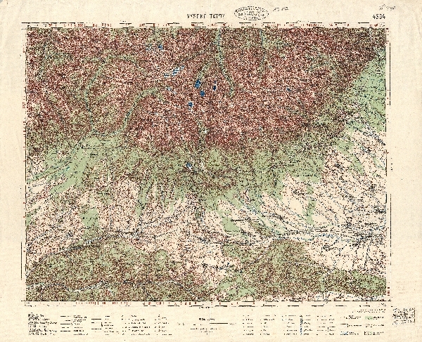 Mapa topograficzna obejmująca Tatry Wysokie i część Tatr Zachodnich po Dolinę Kościeliską oraz Kotlinę Popradzką. Rzeźba przedstawiona metodą poziomicowo - kreskową. Obszar wysokogórski, rysunek skał. Sieć hydrograficzna. Poza ramką objaśnienia w j. cz.